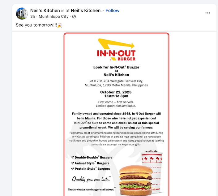 It’s the brand’s first Philippine appearance since its 2022 appearance in Bonifacio Global City, and true to its minimalist tradition, In-N-Out is letting nostalgia and word-of-mouth do the marketing.
