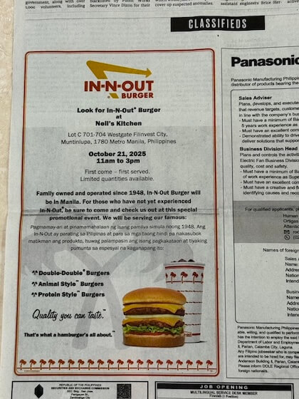 The California-based burger chain kept its comeback under wraps, using a print ads, including in the Philippine Daily Inquirer newspaper, and a few social media mentions from Filinvest City and Neil’s Kitchen instead of a full-blown digital campaign.