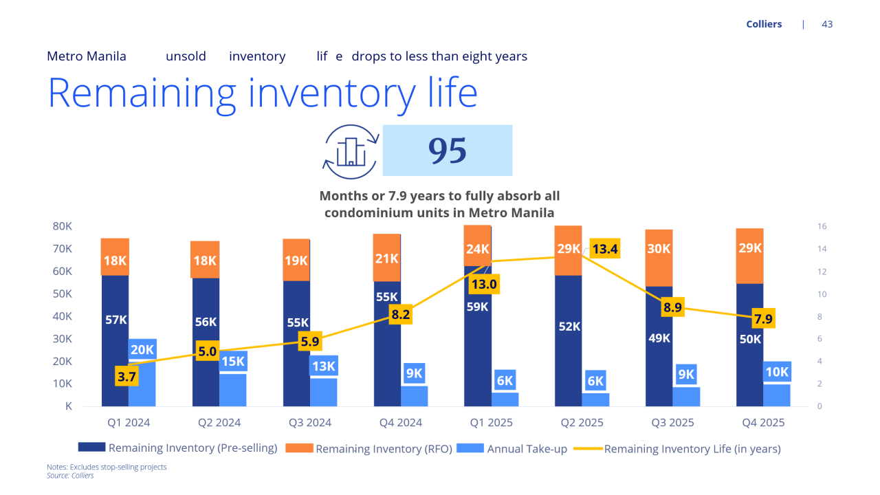 After hitting 13.4 years of inventory life in the second quarter of 2025, unsold inventory eased to 7.9 years in the fourth quarter of 2025, marking a second straight quarterly decline, the property consultancy group said in its recent year-end report.