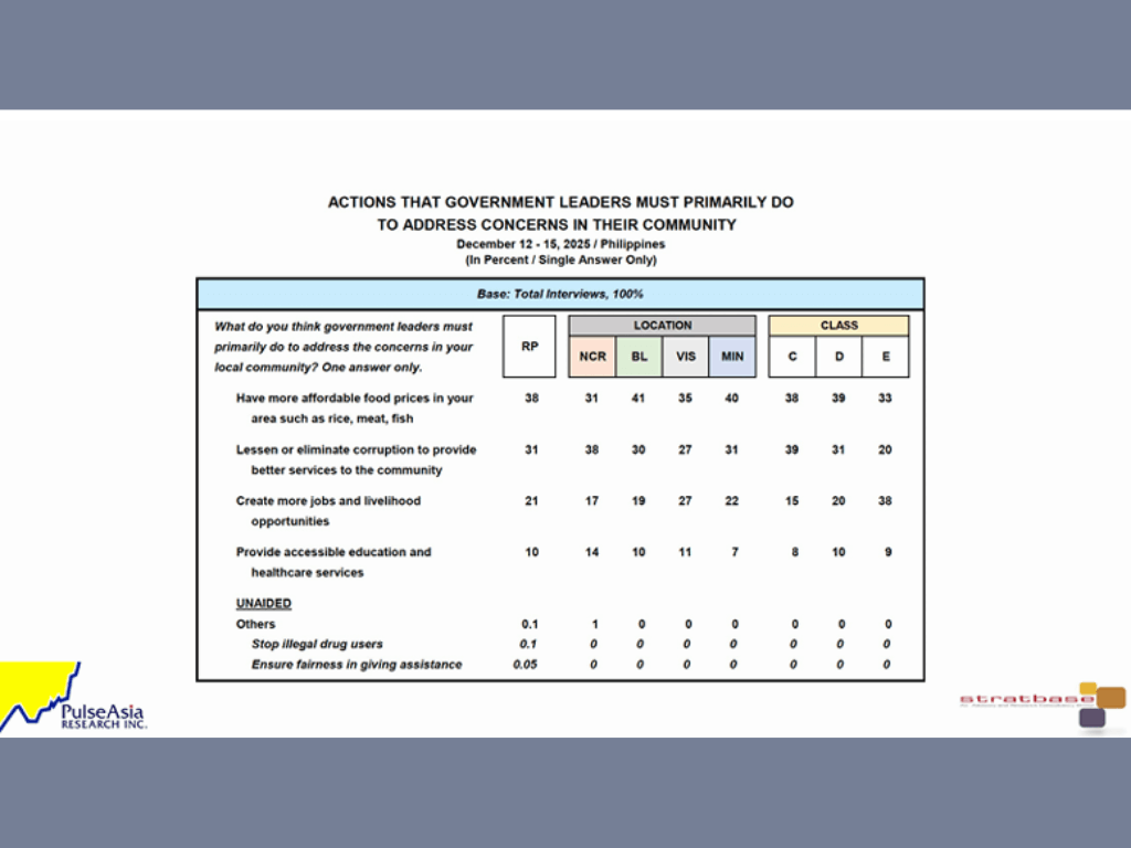 The survey, conducted from December 12 to 15, shows that 38 percent of respondents identified affordable food prices as the most urgent action government leaders should take in their communities. Reducing or eliminating corruption followed at 31 percent, while creating more jobs and livelihood opportunities ranked third at 21 percent.