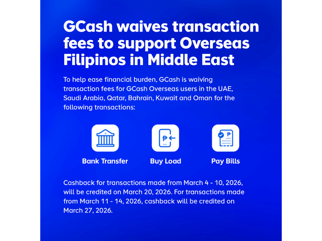 The initiative covers GCash Overseas users in the United Arab Emirates, Qatar, Bahrain, Kuwait, Saudi Arabia, and Oman. Eligible transactions include bank transfers, bill payments, and mobile load purchases conducted through the GCash app.