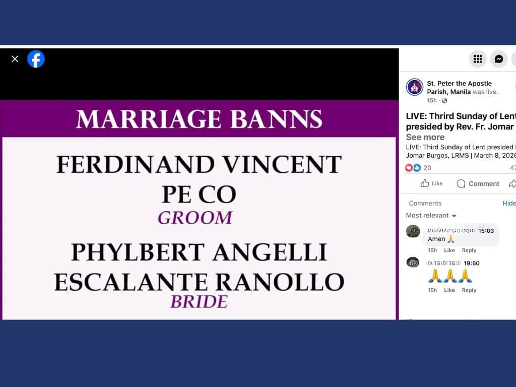 The banns—traditionally read in Catholic churches ahead of a wedding—appeared on screen under the heading “Marriage Banns,” listing Co as the groom and Ranollo as the bride.