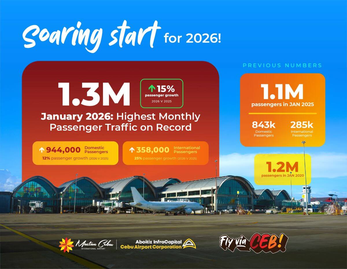 Domestic passenger traffic rose 12% year on year, while international traffic climbed 25%, underscoring strong demand for travel to and through Cebu at the start of 2026.