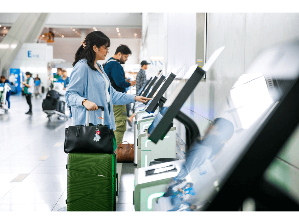 Passengers on eligible flights may use self check-in kiosks near terminal check-in areas, print boarding passes and bag tags, then proceed to bag drop counters or automated lanes before heading to pre-security and self-boarding gates.