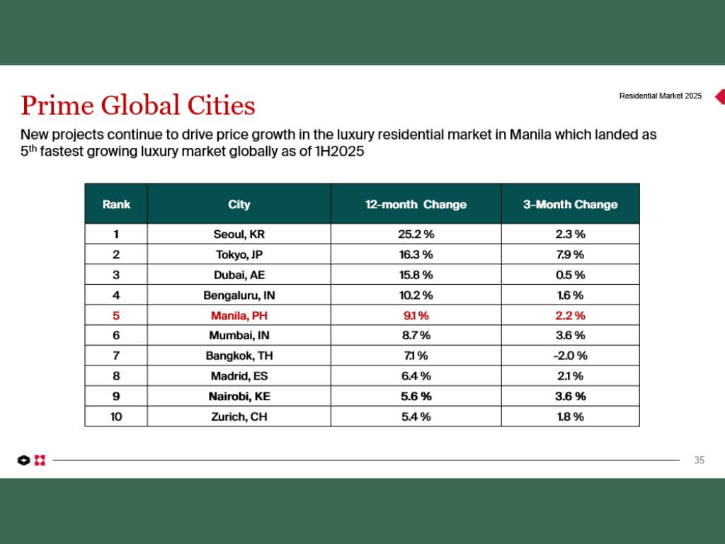Meanwhile, Manila continues to punch above its weight in the global luxury space, ranking 5th in Knight Frank’s Prime Global Cities Index, buoyed by a 9.1-percent year-on-year increase in prices.