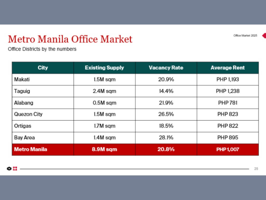 The development pipeline remains robust, with 1.5 million sq.m. scheduled for completion through 2029—primarily in Quezon City, Taguig, and Ortigas. Vacancy sits at 21 percent, while Taguig commands the highest asking rent at P1,242/sq.m./month, 23 percent above the Metro Manila average.